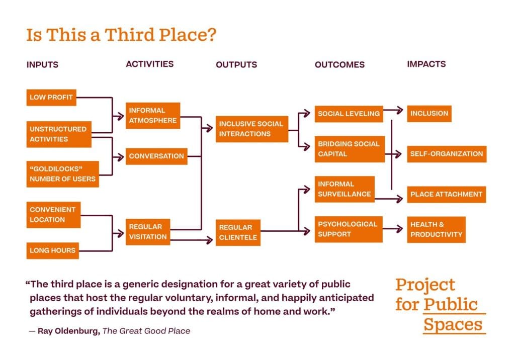 This logic model illustrates the key elements—inputs, activities, outputs, outcomes, and impacts—that help define a third place, as outlined by Ray Oldenburg in The Great Good Place.